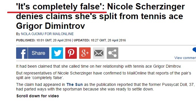 Новината за раздялата на Григор Димитров и Никол Шерцингер зае челни места в повечето световни интернет издания. Според информация на "Сън" 37-годишната певица е изоставила българина заради отказа му да задълбочат вазимоотношенията си.