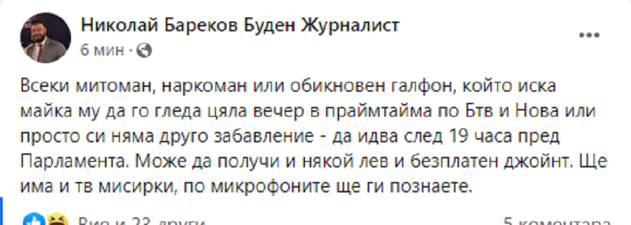 Николай Бареков: Всеки наркоман или обикновен галфон, който иска майка му да го гледа цяла вечер в праймтайма по БТВ и Нова - да идва след 19 часа пред Парламента