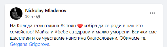Хубавата новина Младенов съобщи във Фейсбук. Бебето е момченце и се казва Стоян.