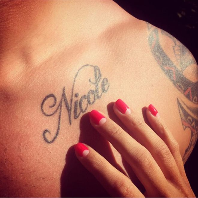 Футболистът написа под рамото си името на дъщеря си, няколко месеца след като Никол се роди през 2012 г., припомня lifestyle.bg. Тогава двамата с Николета бяха във вихъра на връзката си, без да подозират, че само три години по-късно ще се разделят.