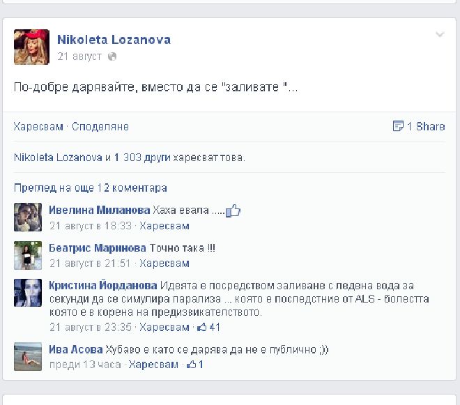 "Ники и аз съм на това мнение! Вчера се изказах против това заливане...но не бях разбрана. Дано измислим и ние някоя благотворителна инициатива, барем американците ни последват, но се съмнявам.", написа плеймейтката във "Фейсбук" в отговор на излиянията на Николета.