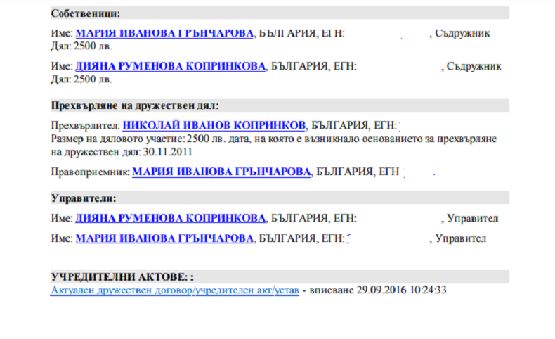 Предвид на неговата позиция като кмет на село Труд, а след това и като секретар на президента, той формално напуска фирмата. Там обаче остава да се разпорежда неговата майка – Диана Руменова Копринкова.