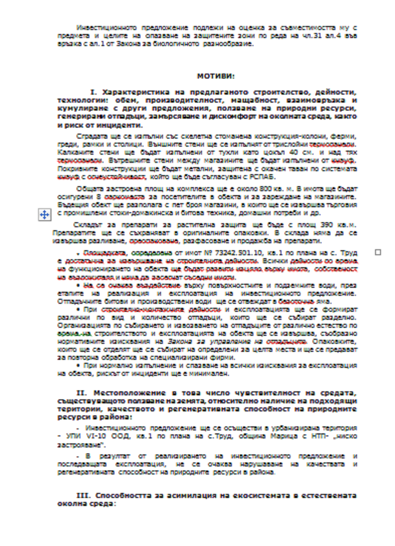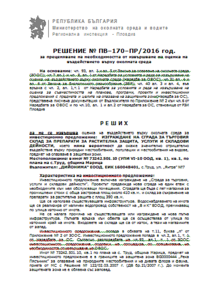Проектът предвижда нова сграда на един етаж с необходимите към нея обслужващи помещения. Сградата ще бъде с пет магазина за промишлени стоки с обща застроена площ около 410 кв.м. и склад за съхранение на препарати за растителна защита с площ 390 кв.м. Интересният детайл е, че имот № 73242.501.10, кв.1 по плана на село Труд, община Марица, предмет на инвестиционното предложение е в границите на защитена зона BG0000444 "Река Пясъчник” за опазване на природните местообитания и на дивата флора и фауна, приета от МС с Решение № 122/02.03.2007 г.