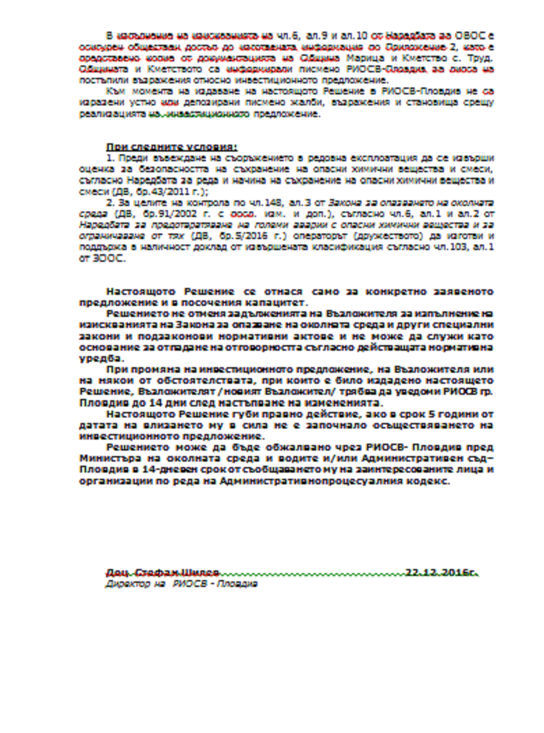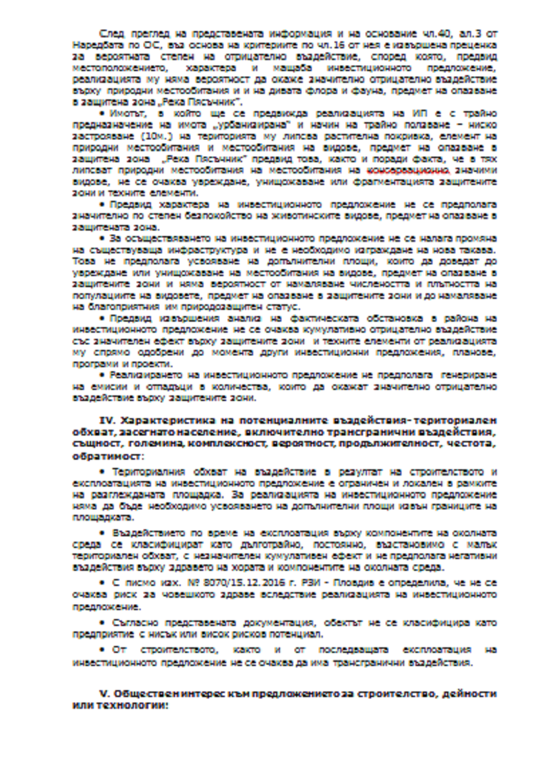 Още по-скандално е, че с Решение № ПВ–170–ПР/22.12.2016 год. РИОСВ-Пловдив решава, че не е необходимо да се извършва оценка на въздействието върху околната среда за инвестиционно предложение.