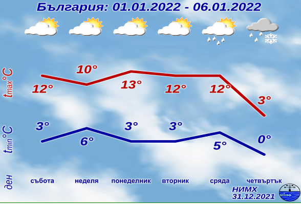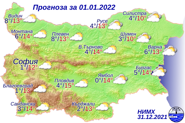 През първия ден от новата година облачността ще е променлива, преди обяд над източната част от страната и планините, по-често значително, но без съществени валежи. Ще е ветровито - с умерен, в Дунавската равнина и западната част на Горнотракийската низина и силен вятър от запад-северозапад. Ще се затопли още и максималните температури ще бъдат между 10 и 15 градуса, в София около 12.