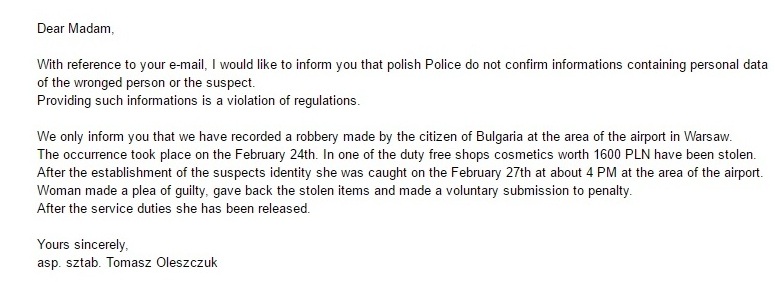 "Полската полиция записа кражба, извършена от гражданка на България в района на летището на Варшава. Случката е станала на 24-ти февруари. В един от безмитните магазини е открадната козметика на стойност 1600 злоти. След установяване на идентичността на заподозряната, тя е заловена на 27-ми февруари около 4 часа следобед в района на летището. Жената се призна за виновна, върна откраднатите неща и доброволно прие наказанието. След приключване на процедурите, тя е освободена", пише в информацията на полската полиция в отговор до "Стандарт".