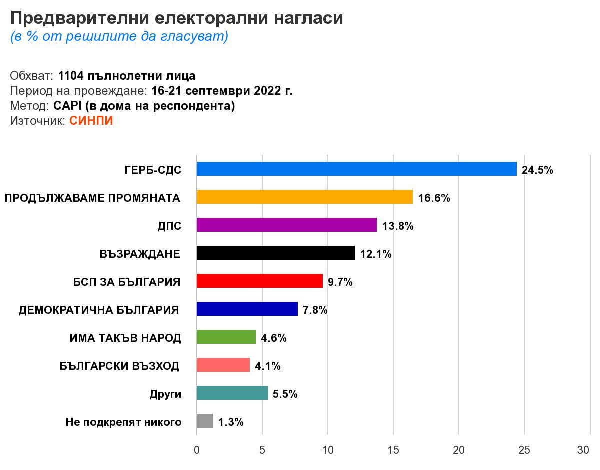 Ниска избирателна активност, фрагментиран парламент, слаба вероятност за формиране на стабилно мнозинство и съставяне на редовно правителство. Това прогнозира Стратегическия институт за национални политики и идеи (СИНПИ) в национално представително проучване в периода 16-21 септември 2022 г. за предварителните електорални нагласи за парламентарните избори на 2 октомври 2022 г.