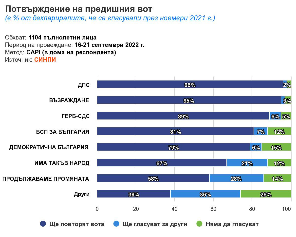 Прави впечатление, че три от формациите (ДПС, „Възраждане“ и коалицията „ГЕРБ-СДС“) постигат сравнително висока степен на мобилизация на предишните си гласоподаватели, като една от тях („Възраждане“) почти удвоява електоралния си потенциал чрез привличането на нови гласове. Сравнително успешно с привличането на нови гласове се представя още една формация („Демократична България“), но в същото време не успява да задържи в достатъчна степен предишните си гласоподаватели.
