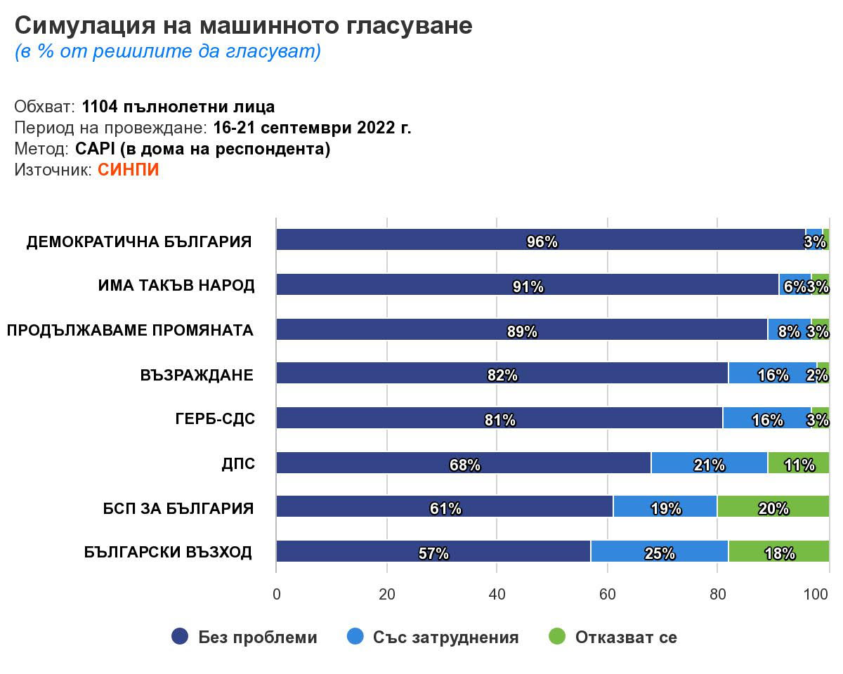 Данните свидетелстват, че масовите предразсъдъци към машинното гласуване до известна степен са основателни. Пропагандното внушение обаче, че проблемите тук имат ясно очертан възрастов профил е напълно невярно. Групите, които изпитват затруднения или се дистанцират от машинното гласуване са разпределени в пропорции, близки до общото разпределение на демографския състав на пълнолетното население. Безспорни лидери по безпроблемно гласуване чрез машини са избирателите на Демократична България и ИТН, а в най-голяма степен от този начин на избор са застрашени ДПС, „БСП за България“ и „Български Възход“.