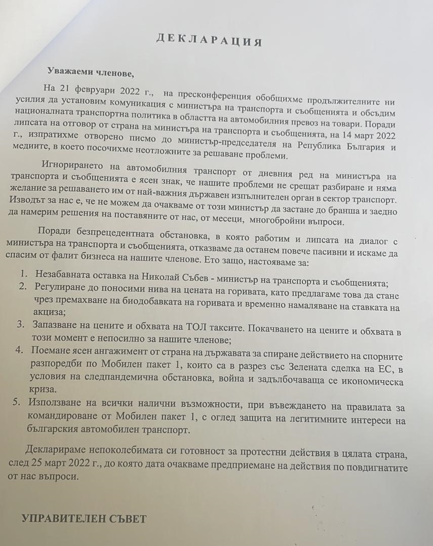 Те настояват за незабавна оставка на Николай Събев. От бранша искат също регулиране до поносими на цените на горивата, запазване на цените и обхвата на ТОЛ таксите, спиране на спорните разпоредби по Мобилен пакет 1 и защита на легитимните интереси на българския автомобилен транспорт.