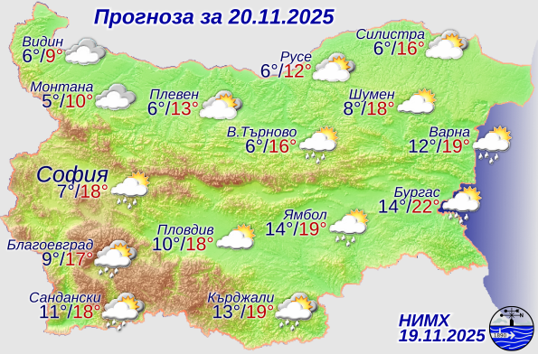 Минималните температури ще бъдат в широки граници - между 5° и 10° в по-голямата част от страната до около 13°-15° в югоизточните райони. Максималните температури ще са предимно между 10° и 15°, в Южна България и местата чувствителни на южния вятър до около 20°-22°. В София минималната температура ще бъде около 7°, а максималната - около 18°. Това съобщават от Национален институт по метеорология и хидрология (НИМХ).