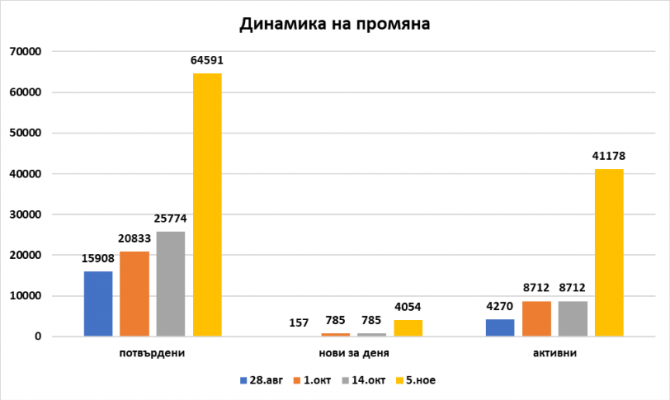 Като илюстрация в графиката се прилагат данни за потвърдени, нови за деня и активни случаи на КОВИД-19 за датите 28 август, 14 октомври и 5 ноември.