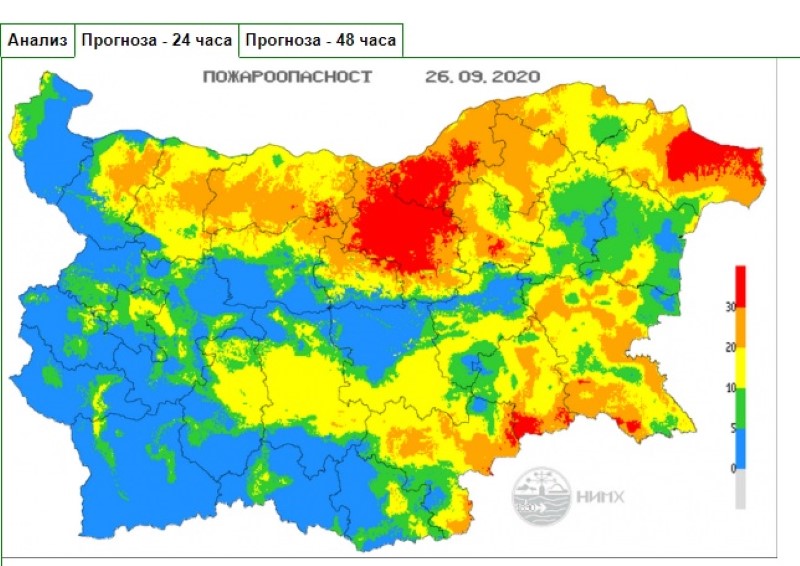Екстремален индекс за пожароопасност е в сила за територии от 8 области в страната. Това сочи справка на сайта на Националния институт по метеорология (НИМХ).