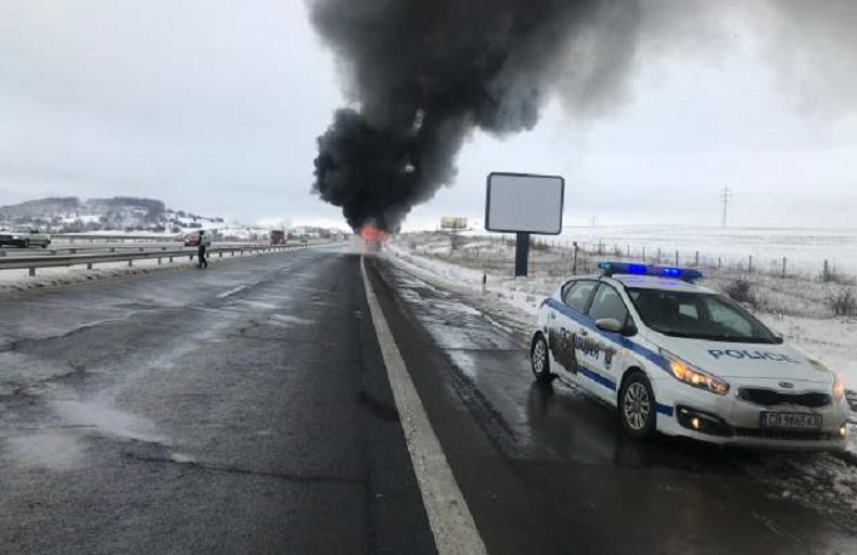 Огнен инцидент шокира пътници на автобус на магистрала "Тракия", съобщиха от МВР. Сигналът е подаден минути след 10 ч., когато превозното средство пламва отзад, докато се движи.