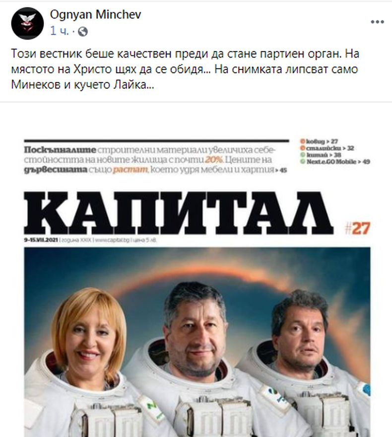 Този вестник беше качествен преди да стане партиен орган. На мястото на Христо щях да се обидя... На снимката липсват само Минеков и кучето Лайка..." Това написа в профила си във "Фейсбук" политологът Огнян Минчев. Поводът е новата корица на „Капитал“, на която са изобразени “астронавтите“ Мая Манолова, Христо Иванов и Тошко Йорданов.