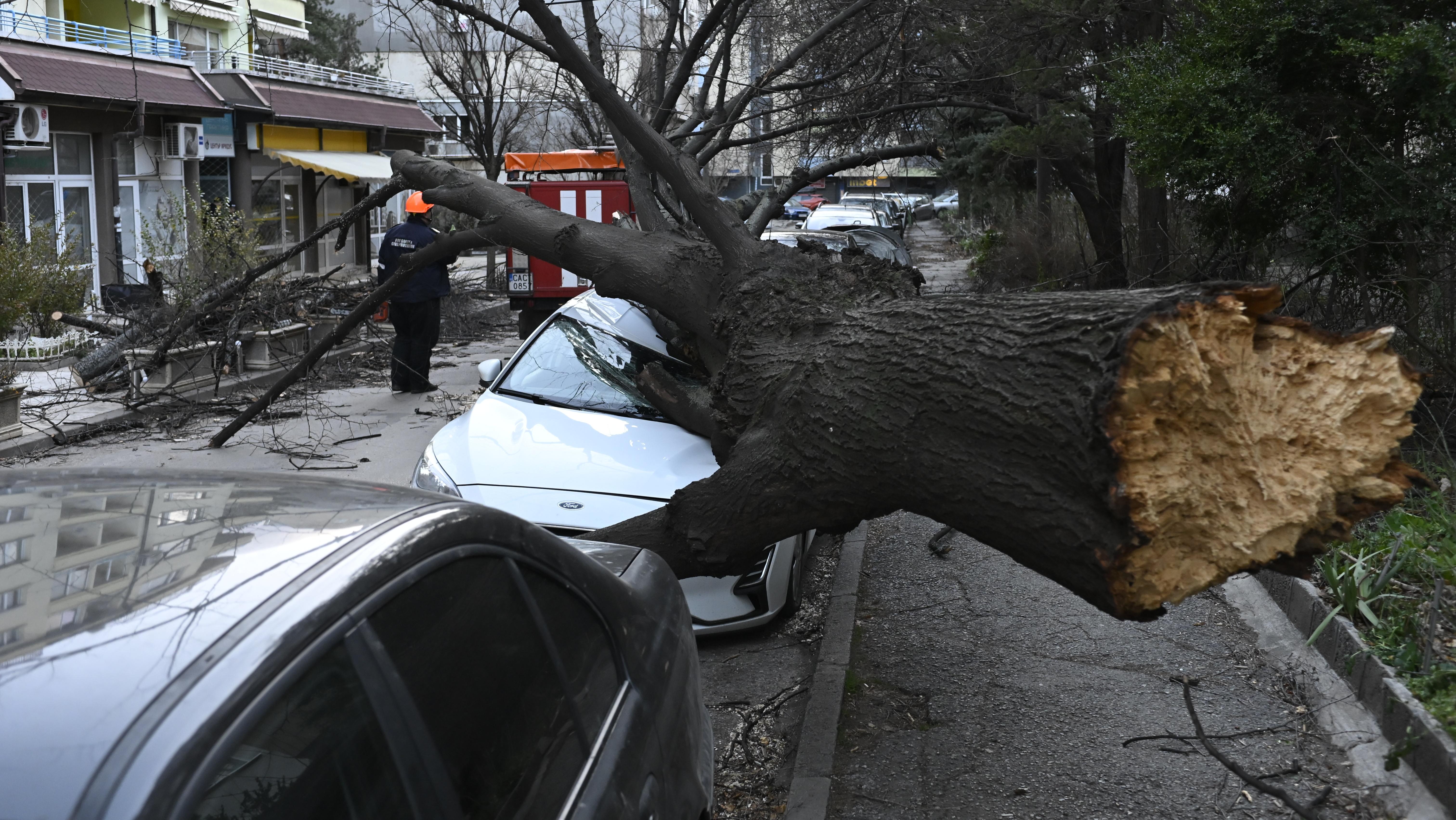 Заради бурния вятър огромно дърво рухна върху автомобил в столицата София. По чудо при инцидента няма жертви, тъй като дървото е паднало и върху иначе оживен тротоар.