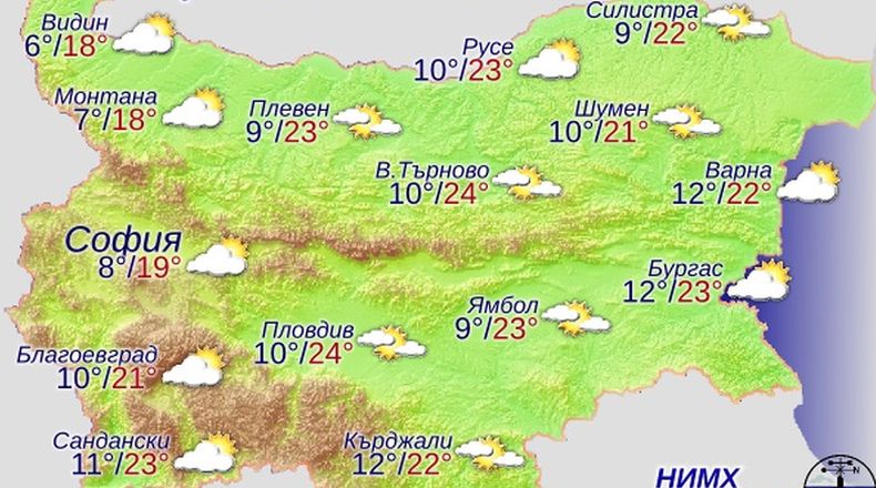 Преди обяд днес в много райони ще бъде мъгливо, но по-късно през деня мъглата ще се разсейва и над страната ще преобладава слънчево време с разкъсана средна и висока облачност, съобщават от Националния институт по метеорология и хидрология (НИМХ), цитирани от „Фокус”.