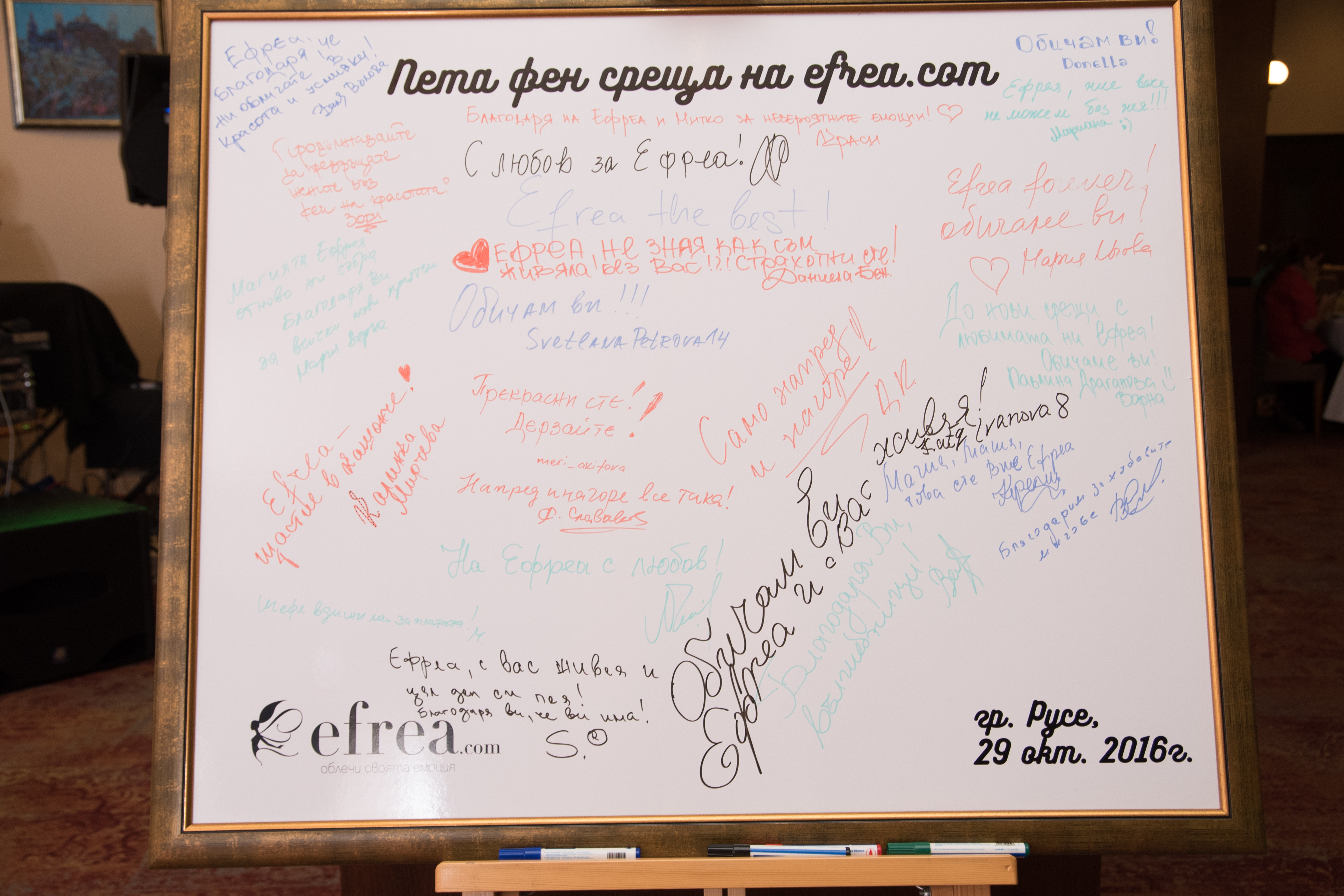 На 29-ти октомври се състоя петата юбилейна фен среща на онлайн магазина efrea.com. Мястото на събитието беше ресторантът на хотел „Дунав Плаза” в град Русе. Дрескодът на вечерта, разбира се беше дрехи с марка Ефреа.