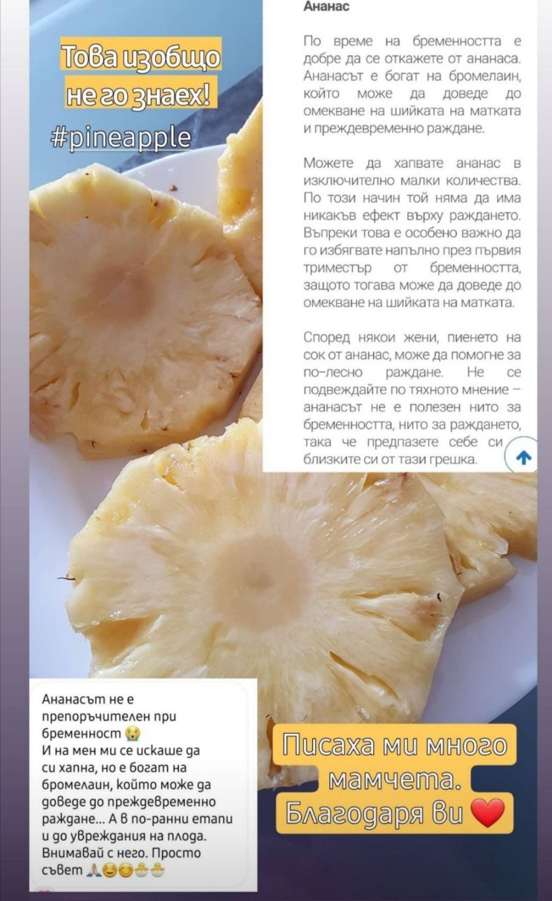 След като качи стори с ананаса, притеснени майки образоваха Веселинова, че е по-добре да не повтаря закуската си, докато роди. По принцип, ананасът е много полезен за организма, поради наличието на витамин С, А, калий, манган, магнезий и други. Причината обаче да не се препоръчва при бременност е наличието на бромелаин ензими, които могат да омекотят матката и таза, като предизвикат силни контракции или спонтанен аборт. Ананасът може да причини диария или алергия.