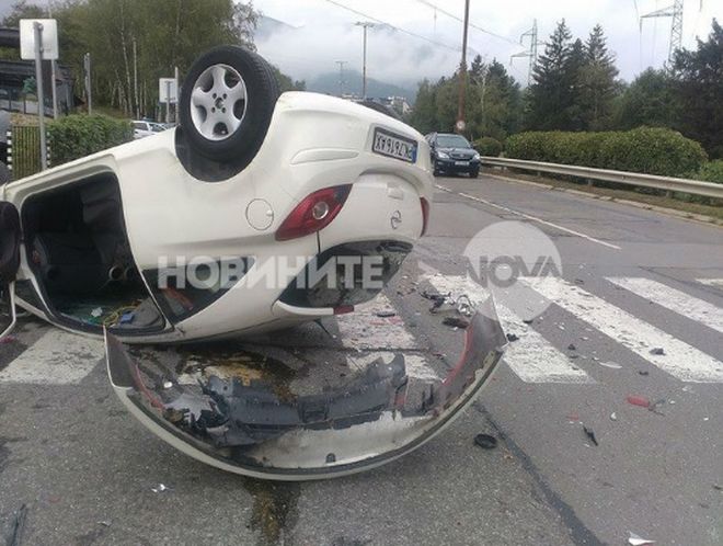 Третият автомобил, шофиран от млада жена от Перник, се движи с несъобразена скорост и не успява да спре навреме. След като натиска спирачките докрай, шофьорката се опитва да мине между двете коли, но от удара автомобилът се пребръща и пада по таван на платното, съобщава Нова телевизия.