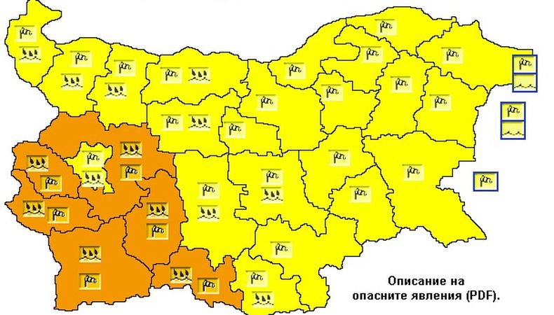 Оранжев код за силен вятър и интензивни валежи е в сила за 6 области в страната за днес. Предупреждението важи за областите Смолян, Пазарджик, Благоевград, Кюстендил, Перник и София-област. В тези области ще има значителни валежи, като в отделни райони количеството им ще достига 35-50 л/кв. м. Ще духа умерен до силен юг-югозападен вятър с пориви до 18-20 м/с.