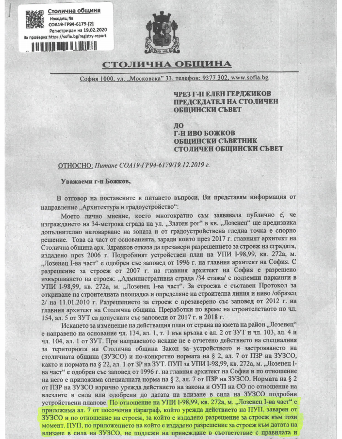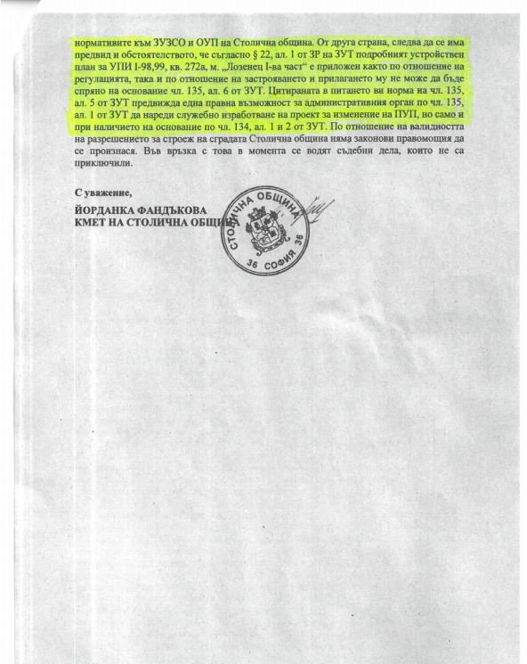 В отговора си кметът на София разясни за пореден път, че прилагането на подробния устройствен план не може да бъде спряно. Тоест, не може при започнал строеж на законна сграда със законни книжа на някой да му хрумне да промени този строеж.