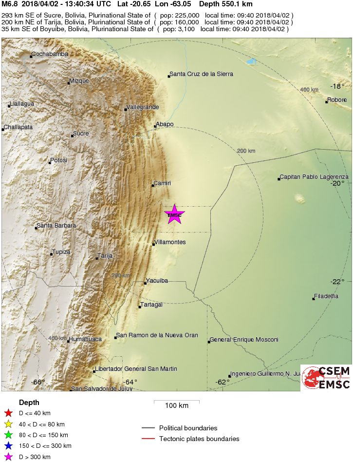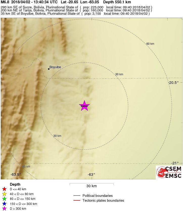 Земетресение с магнитуд 6,8 бе регистрирано на около 209 км на изток-североизток от град Тариха в Боливия. Трусът е бил на внушителната на дълбочина от 550 км, съобщи Геофизичният институт на САЩ, цитиран от Ройтерс.