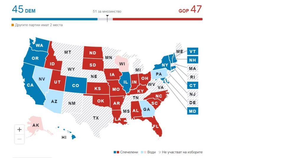 Според информация на в. "Ню Йорк таймс" републиканците си гарантират 168 места в долната камара на американския парламент, а демократите – 114. Що се отнася до Сената – Демократическата партия получава 45 места, а за Републиканската партия – 46, посочва още изданието.