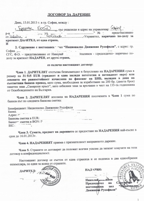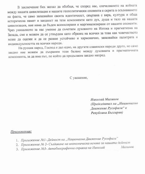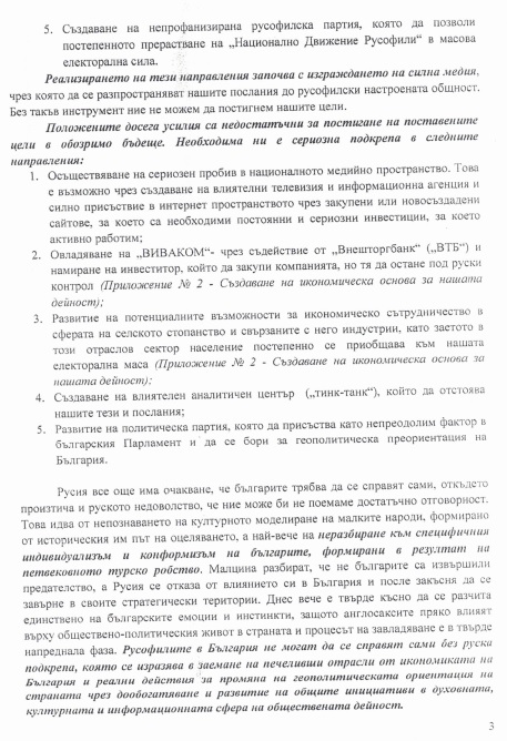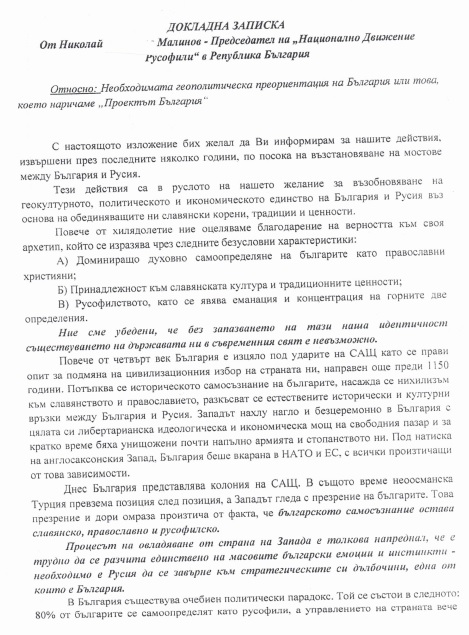 На 12.09.2019 г., с разрешение на наблюдаващия прокурор, Прокуратурата на Република България разгласи докладна записка на руски език, изготвена от обв. Николай Малинов, в която в качеството на председател на „Национално Движение Русофили“ в Република България е изложил вижданията си за геополитическа преориентация на България и стратегия, чрез която същата да бъде постигната. Прокуратурата публикува и документи, касаещи „КТБ“ АД, „ДУНАРИТ“ АД и „ЕМКО“ ЕООД.