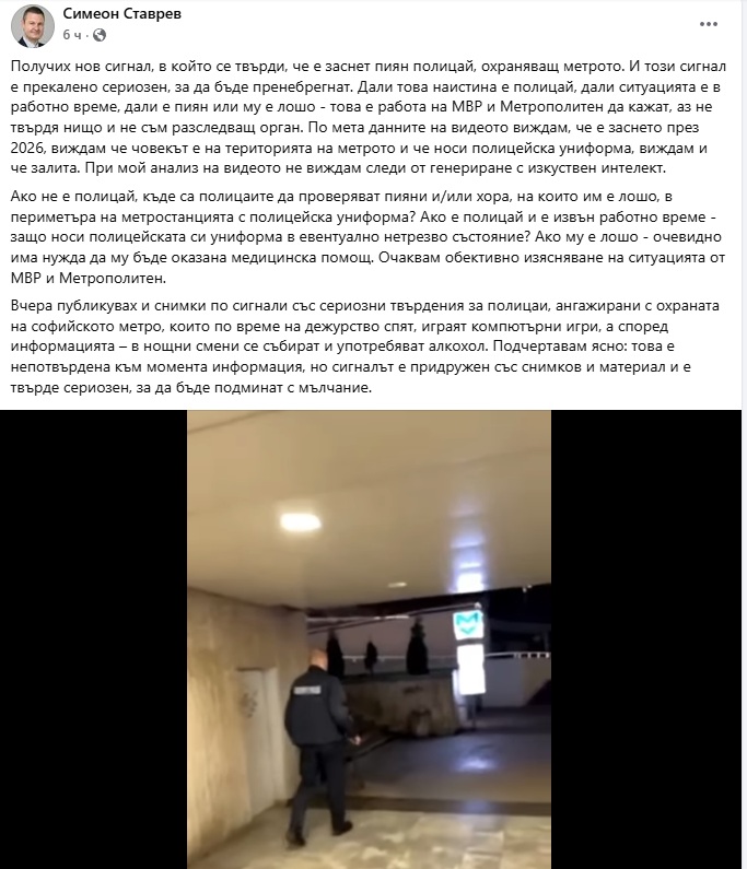 Тази сутрин Ставрев разпространи видео в социалните мрежи, на което се вижда пиян полицай в подлеза на метрото. По думите на общинския съветник, видеото е получено от очевидец, а мета данните показвали, че е заснето през 2026 г.