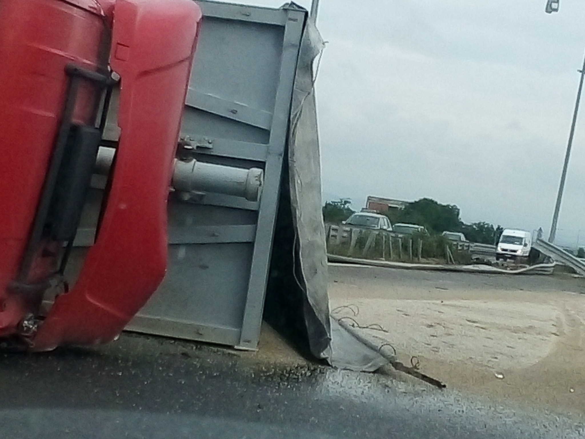 Огромен камион се е обърнал на Северната тангента преди минути. Според очевидци камионът е карал бързо и поради мокрия асфалт не е успял да овладее натоварения камион.