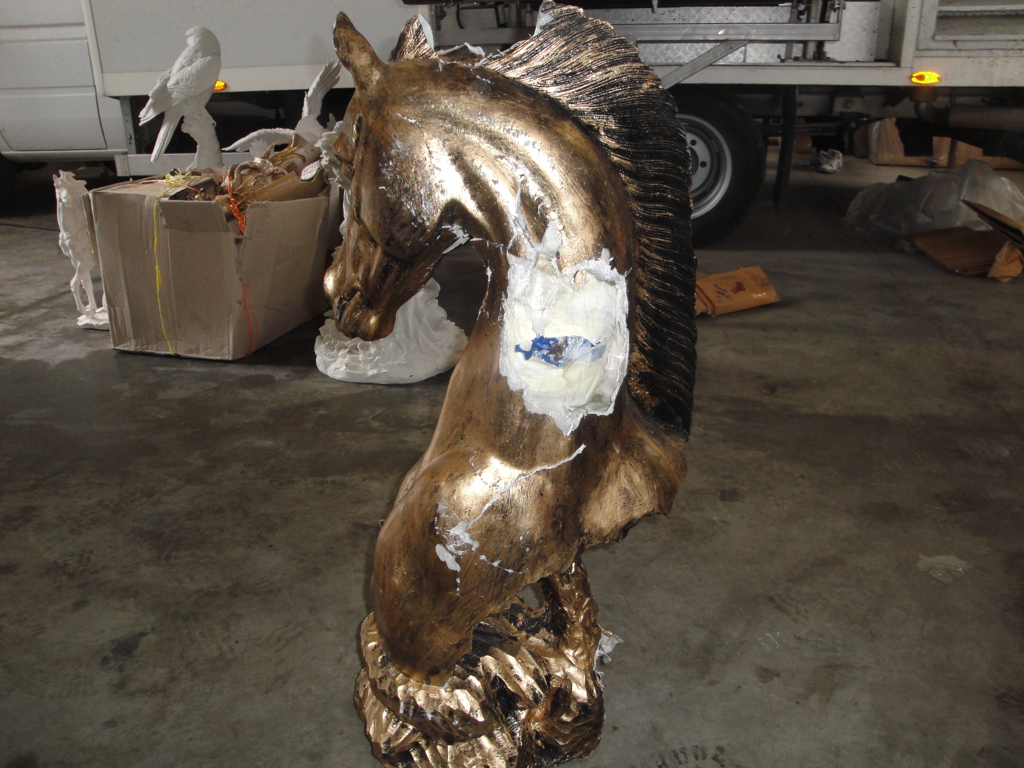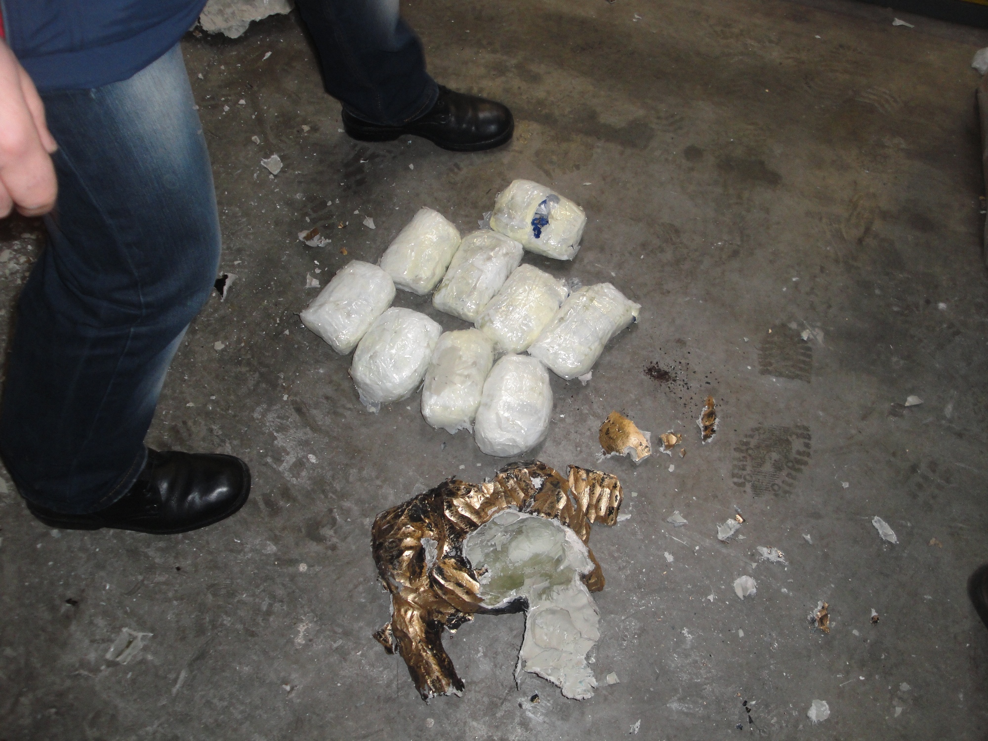 Шофьорът е представил редовни документи за 152 гипсови статуи на животни и хора. Камионът е насочен за проверка с рентгенова апаратура, при която са отбелязани нехарактерни уплътнения в една от статуите - конска глава, изработена от полиестер. Митническите служители пробиват статуята, в която откриват скритите вътре 9 пакета с тъмнокафяво смолисто вещество, което при полевия наркотест реагира на опиум. Наркотикът е с общо тегло 4,8 кг.