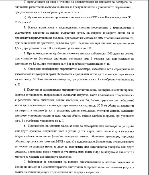 В същата заповед се посочва, че всички спортни мероприятия могат да се провеждат пред публика при заетост на местата до 50% от общия им капацитет, при настаняване на зрителите най-малко през 1 седалка или при спазване на дистанция от 1,5 м.