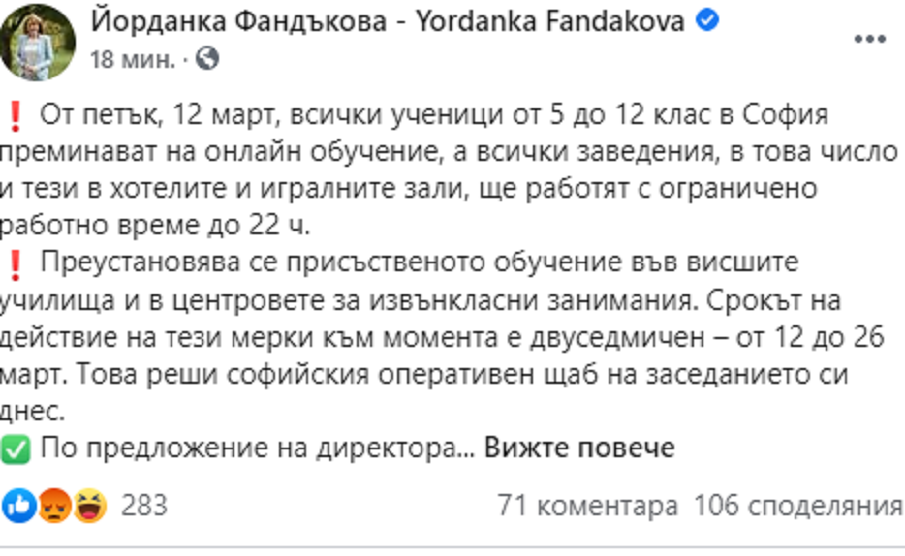 От петък, 12 март, всички ученици от 5 до 12 клас в София преминават на онлайн обучение, а всички заведения, в това число и тези в хотелите и игралните зали, ще работят с ограничено работно време до 22 ч.