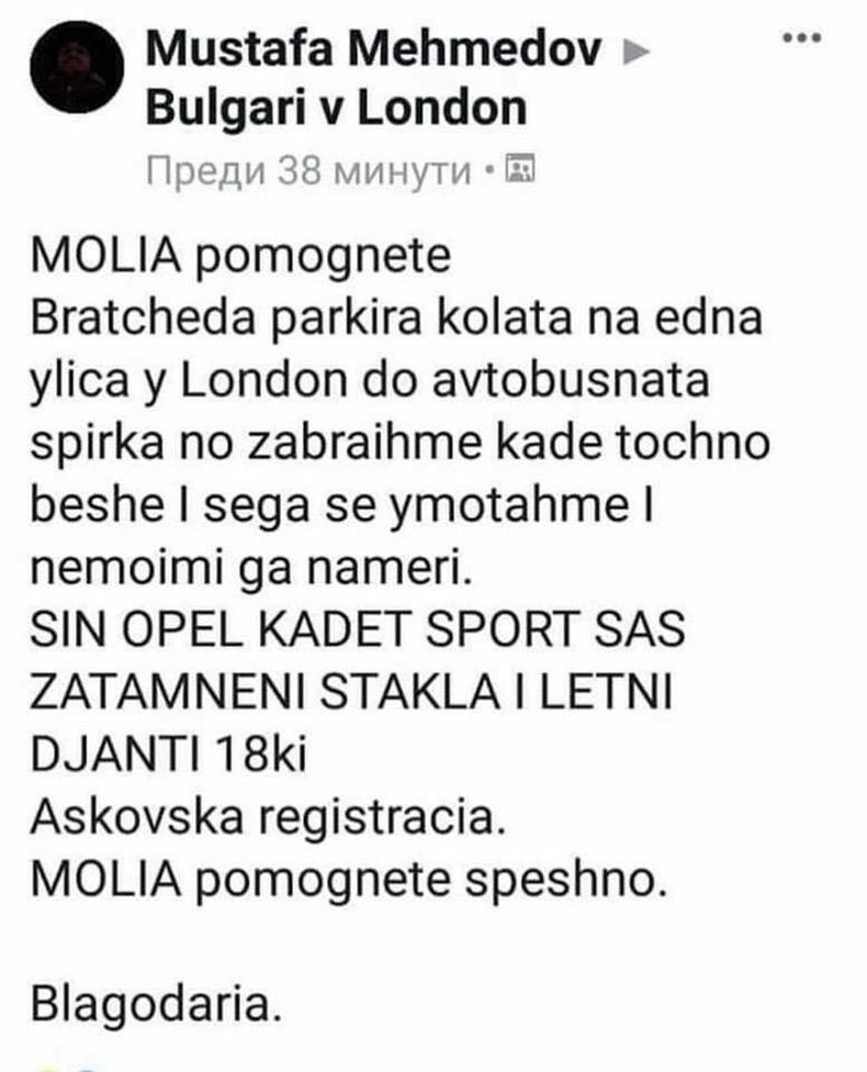 "Моля помогнете. Братовчедът паркира колата на една улица в Лондон до автобусната спирка, но забравихме къде точно беше и сега се умотахме и не можем да го намерим. Син Опел Кадет спорт със затъмнени стъкла и летни джанти 18-ки. Асковска регистрация. Моля помогнете спешно", пише на латиница Мустафа.