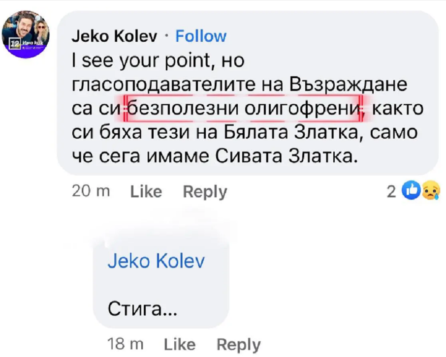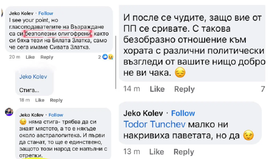 “Този народ се напълни с отрепки“, пише умният и красив Жеко Колев, очевидно ядосан, че над 29 000 от гласувалите на предишните избори за ПП или ДБ, са дали своя глас на 2 април за "Възраждане“.