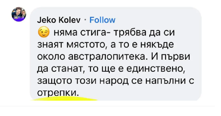 Според Колев гласувалите за партията на Костадин Костадинов трябва да си знаят мястото, а то било някъде около австралопитека.