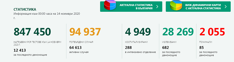 4212 са новодиагностицираните с коронавирусна инфекция лица през изминалите 24 часа. Така потвърдените случаи от 8 март, когато беше отчетен първият положителен, вече стана 94 937. 64 613 пък са активните случаи към 13 ноември.