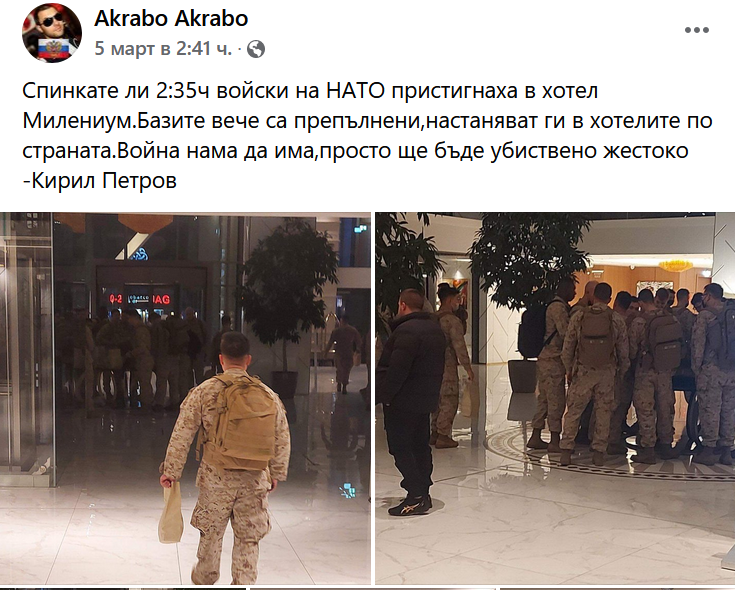 Поредна паника тресе хората през Интернет. Потребители на мрежата са силно притеснени и споделят снимки на НАТО-вци в софийски хотели. Какво се случва, къде е Кирил Петков и правителството му да обяснят ставащото, питат хората.