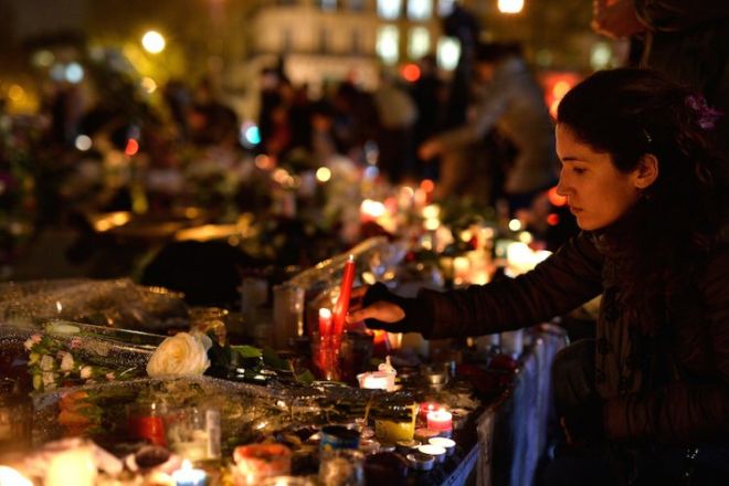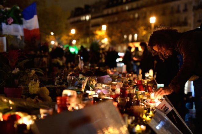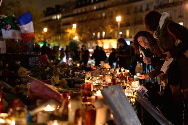 Много парижани запалиха свещи и пяха песни за 130-те убити, въпреки че най-малко един заподозрян е на свобода и има опасения, че е възможно още джихадисти да са проникнали в Европа предвид слабия граничен контрол. 13 Прокуратурата е установила с помощта на пръстови отпечатъци, че двама от седмината нападатели, които загинаха при атентатите, са влезли в ЕС през Гърция на 3 октомври. Други четирима са били френски или белгийски граждани. Един от нападателите все още не е разпознат. Друг, Салах Абдеслам, остава на свобода.