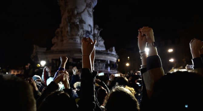 Пред концертната зала "Батаклан" - сцена на най-смъртоносната от атаките, отнела живота на 89 души - една жена пя, а друга й акомпанира на пиано. Демонстрациите са забранени в Париж след атентатите. Много хора обаче се събират спонтанно пред атакуваните заведения във френската столица, за да оставят цветя, да запалят свещи или да проведат мълчаливи бдения. Голям брой послания зоват към любов и обещават, че касапницата няма да тласне парижани към омраза и подозрителност.