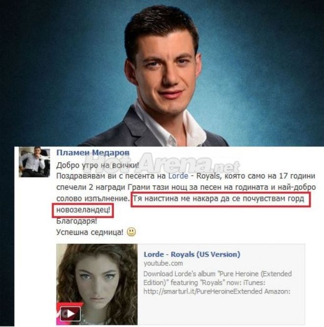 Псевдомилионерът от Нова Зеландия публикува статус, в който заявява, че се чувства горд новозеландец, тъй като певицата Lorde е спечелила цели две награди “Грами“.