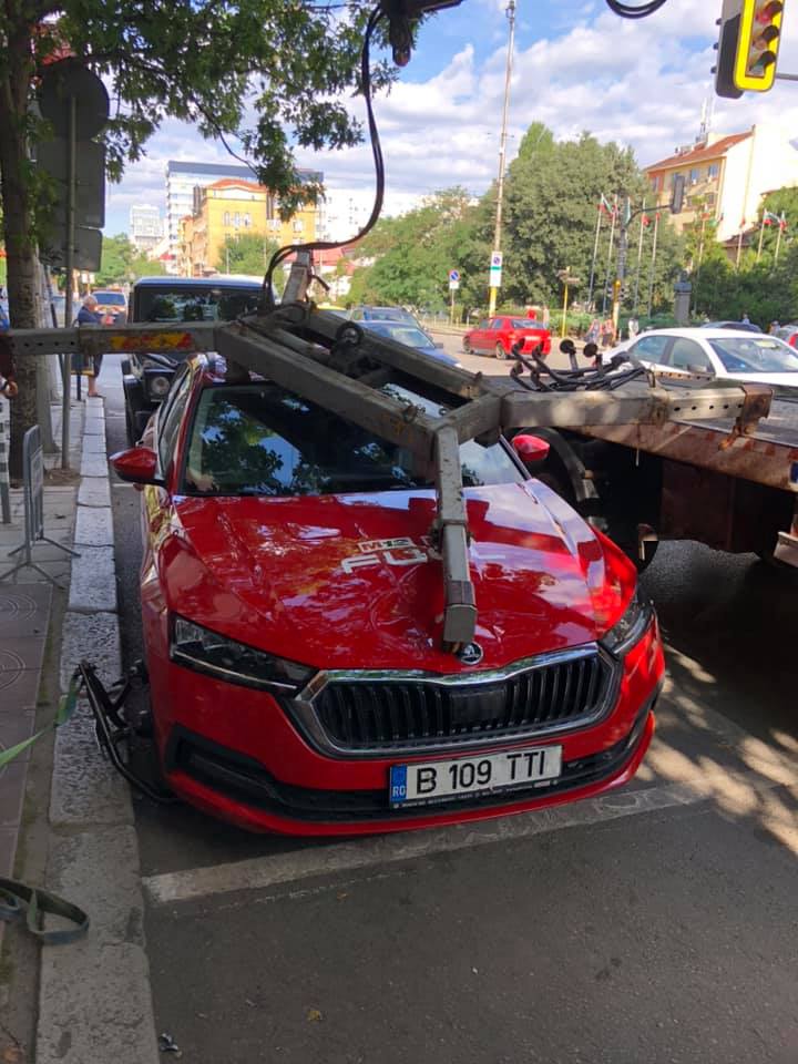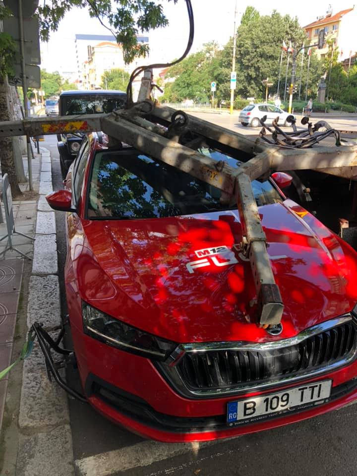 Снимки от ужасяващия инцидент на кръстовището на булевардите "Христо Ботев" и "Александър Стамболийски" в центъра на столицата бяха разпространени в социалните мрежи. На тях се вижда, че пострадалата кола е с румънска регистрация. До инцидента най-вероятно се стигнало, след като кранът на "паяка" се е счупил и е поддал, поради което куката му се е стоварила върху румънското возило.