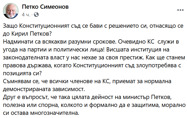Петко Симеонов пита: Защо се бави решението на КС за Кирил Петков? Надминати са всякакви разумни срокове. Очевидно съдът служи в угода на партии и политически лица!