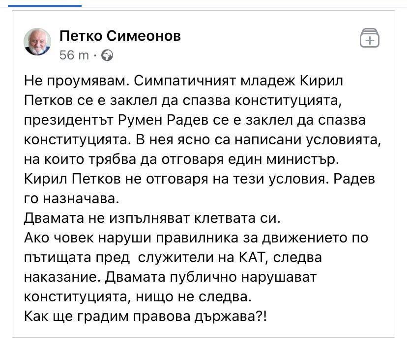 Бившият съучредител на СДС Петко Симеонов написа гневен коментар по повод двойното гражданство на икономическият министър Кирил Петков. Симеонов отчита, че в случая колкото Конституцията на България се нарушава от канадеца Петков, толкова и от назначилия го на поста – Румен Радев.