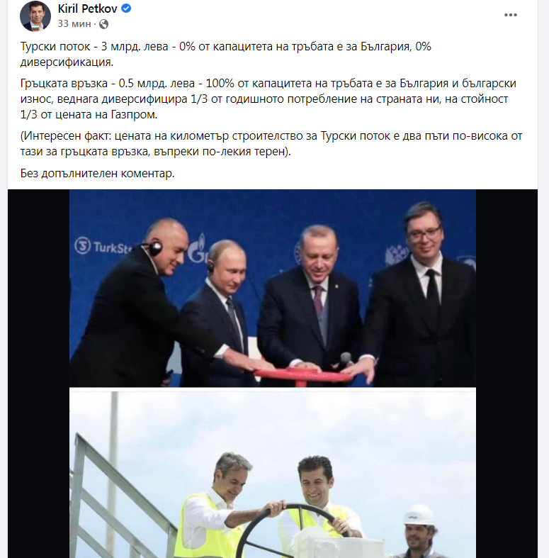 Петков написа: "Гръцката връзка - 0,5 млрд. лева, 100% от капацитета на тръбата е за България и български износ, веднага диверсифицира 1/3 от годишното потребление на страната ни, на стойност 1/3 от цената на "Газпром".