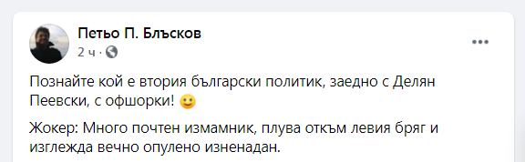 Петьо П. Блъсков: Вторият български политик с офшорки е много почтен измамник и изглежда вечно опулено