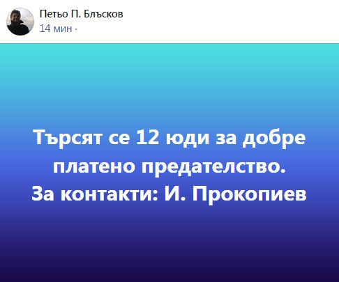 "Търсят се 12 юди за добре платено предателство. За контакти: И. Прокопиев." Това написа в профила си във "Фейсбук" заместник-главният редактор на "Труд" Петьо П. Блъсков.