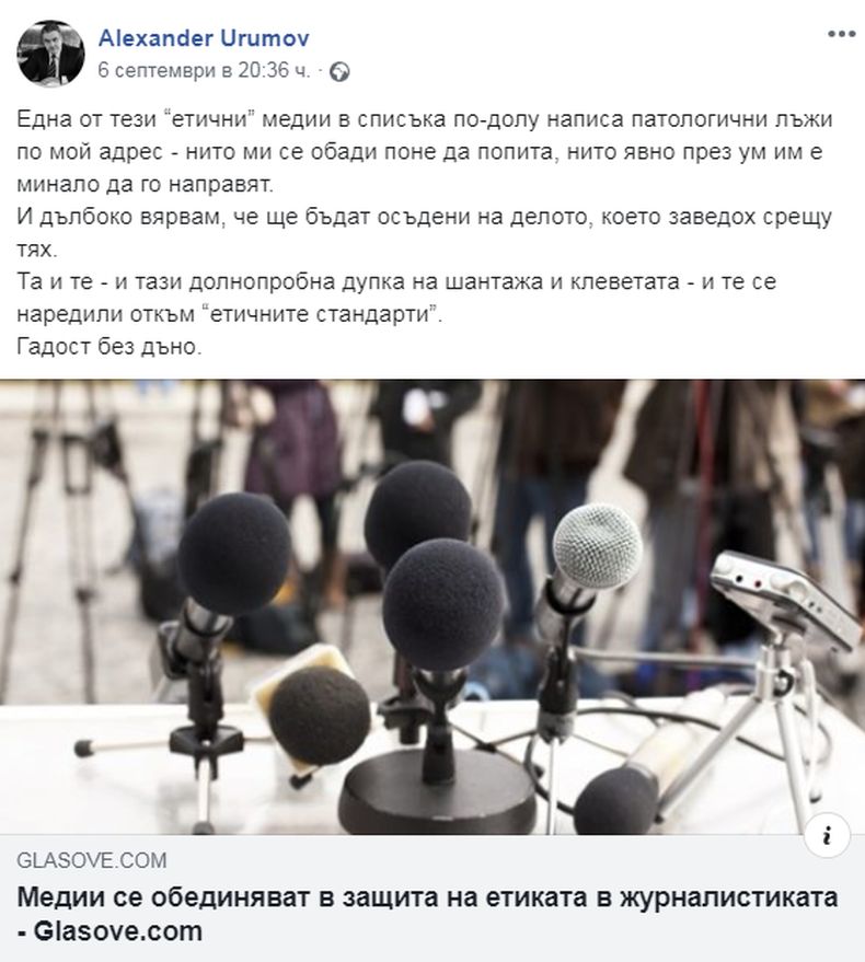 "Една от тези “етични” медии в списъка написа патологични лъжи по мой адрес - нито ми се обади поне да попита, нито явно през ум им е минало да го направят", написа Урумов в профила си във фейсбук. Той вярва, че ще бъдат осъдени по заведеното от него дело.