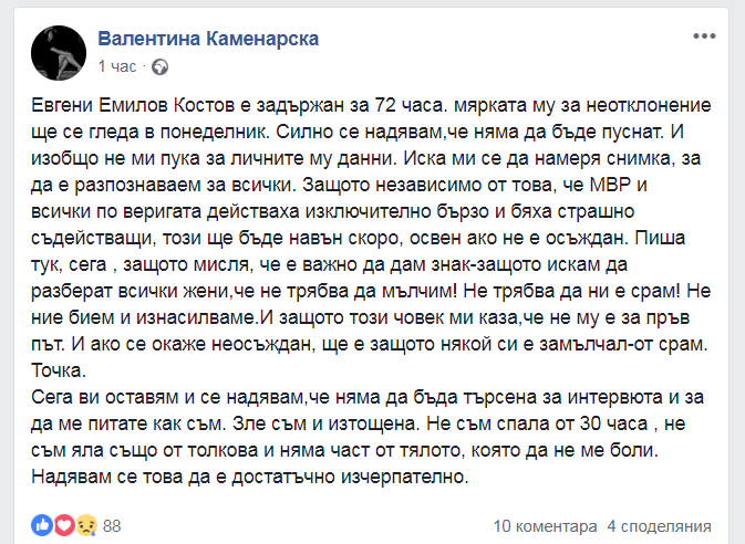 Евгени Емилов Костов е задържан за 72 часа. мярката му за неотклонение ще се гледа в понеделник. Силно се надявам,че няма да бъде пуснат. И изобщо не ми пука за личните му данни. Иска ми се да намеря снимка, за да е разпознаваем за всички. Защото независимо от това, че МВР и всички по веригата действаха изключително бързо и бяха страшно съдействащи, този ще бъде навън скоро, освен ако не е осъждан. Пиша тук, сега , защото мисля, че е важно да дам знак-защото искам да разберат всички жени,че не трябва да мълчим! Не трябва да ни е срам! Не ние бием и изнасилваме.И защото този човек ми каза,че не му е за пръв път. И ако се окаже неосъждан, ще е защото някой си е замълчал-от срам. Точка. Сега ви оставям и се надявам,че няма да бъда търсена за интервюта и за да ме питате как съм. Зле съм и изтощена. Не съм спала от 30 часа , не съм яла също от толкова и няма част от тялото, която да не ме боли. Надявам се това да е достатъчно изчерпателно.", написа тя в социалните мрежи.